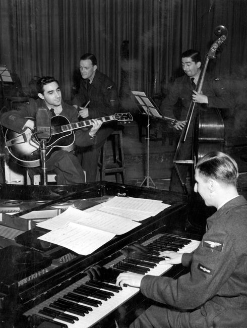 Members of No 1 RAF Dance Band - The Squadronnaires - pictured during a radio broadcast at the BBC's Paris Theatre in London, 16 April 1945. Formed in early 1940, the band was made up of former members of popular dance bands who were invited to join the RAF and form a Service dance orchestra. It was voted the UK's favourite band in a competition run by a newspaper in 1944. The band played at RAF stations, aircraft factories, Red Cross and other auxiliary units raising funds for charities.